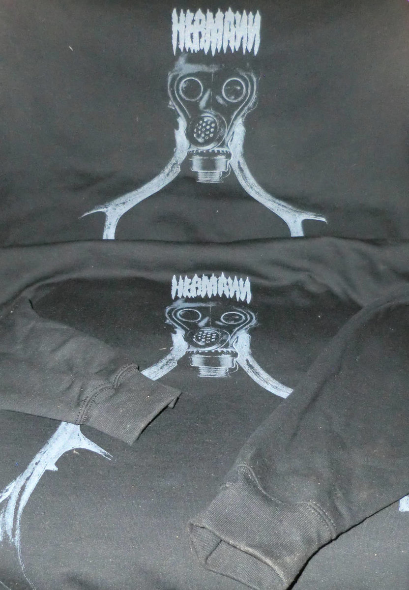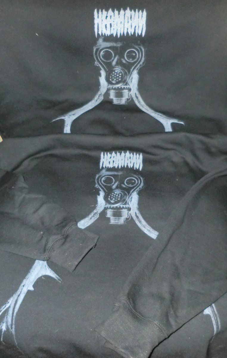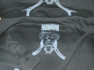 Grey screen print in black cotton. Thick quality "Gildan Heavy Blend" sweat shirt without hood, available in sizes ′M′ and ′L′ .